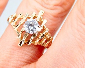 Diamond Cut Branch Motif Yellow Gold Cubic Zirconia Center Solitaire Ladies Ring