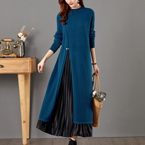 Womens Gown Elegant Fake Two Piece Round Neck Long Sleeves Knitted Sweater Dress