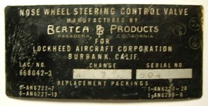 Bertea / Lockheed Aircraft Data Plate - Nose Wheel Steering - Used Off Aircraft