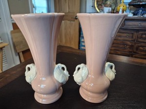 Pair of 2 Vintage Pink Vases 2 Swan Handle Chadwick China Art Pottery 8 1/2 Inch