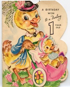 Vintage Happy Birthday Greeting Card Darling One Year Old Mama Duck Baby c1940s
